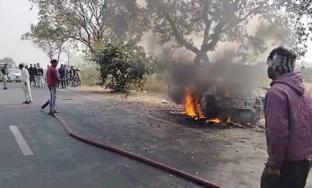 खंडवा-इंदौर मार्ग पर एक कार पेड़ से टकराई गई, लगी आग, अंदर बैठे 5 लोग जान बचाकर भागे