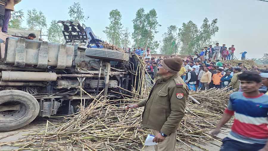 लखीमपुर खीरी में धौरहरा-सिसैया मार्ग पर गन्ने से भरा ट्रक पलट, कई बच्चे दबे