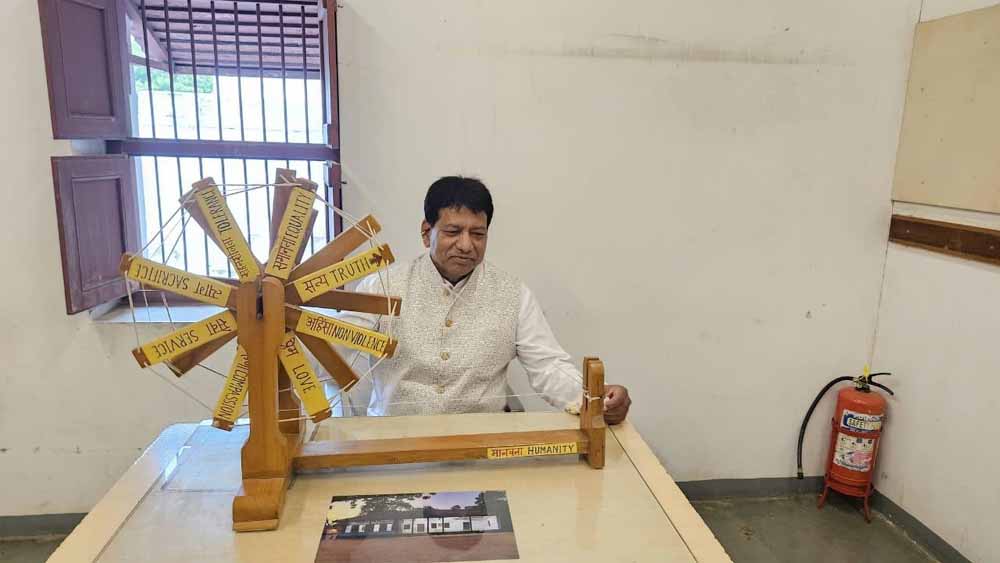 विधायक गोपालसिंह इंजीनियर ने साबरमती आश्रम में चरखा चलाया,आश्रम में स्थापित महात्मा गांधी की प्रतिमा पर सूत की माला पहना कर बापू को नमन किया ।