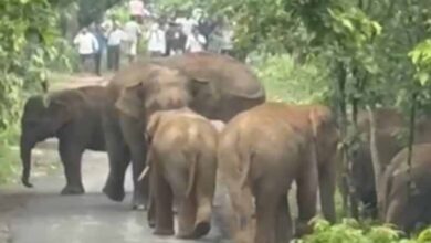 एडु-सिंघनपुर मार्ग पर आधा दर्जन हाथियों का दल अचानक पहुंचा सड़क पर