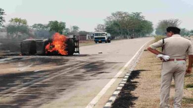 नेशनल हाईवे 30 पर डीजल टैंकर पलटा, लगी आग, ड्राइवर और हेल्पर घायल