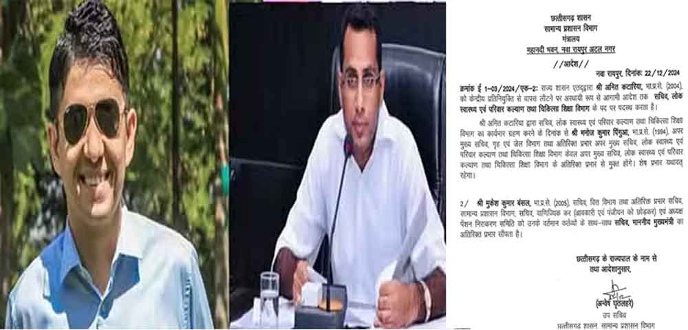 आईएएस सुबोध कुमार सिंह को मुख्यमंत्री सचिवालय में प्रमुख सचिव बनाये जाने के बाद छत्तीसगढ़ सरकार ने फिर एक अहम नियुक्ति की है। केंद्रीय प्रतिनियुक्ति से वापस लौटने के बाद आईएएस अमित कटारिया को लोक स्वास्थ्य एवं परिवार कल्याण तथा चिकित्सा शिक्षा विभाग का सचिव बनाया गया है।