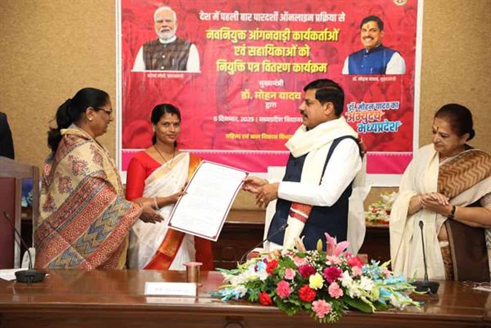 मुख्यमंत्री डॉ. यादव ने प्रतीक स्वरूप तीन नवनियुक्त आंगनबाड़ी कार्यकर्ताओं और सहायिकाओं को नियुक्ति-पत्र प्रदान किए।