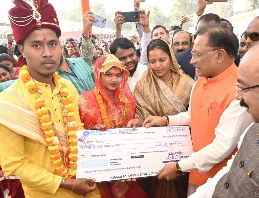मुख्यमंत्री विष्णुदेव साय सामूहिक विवाह सम्मेलन में शामिल हुए। इस दौरान उन्होंने नव दंपत्ति को आशीर्वाद देकर उनके सुखद भविष्य की शुभकामनाएं दी। मुख्यमंत्री ने नव विवाहित नीलू कुमारी और ममता केवट को विवाह प्रोत्साहन राशि के 35-35 हजार रुपए की राशि का चेक प्रदान किया।