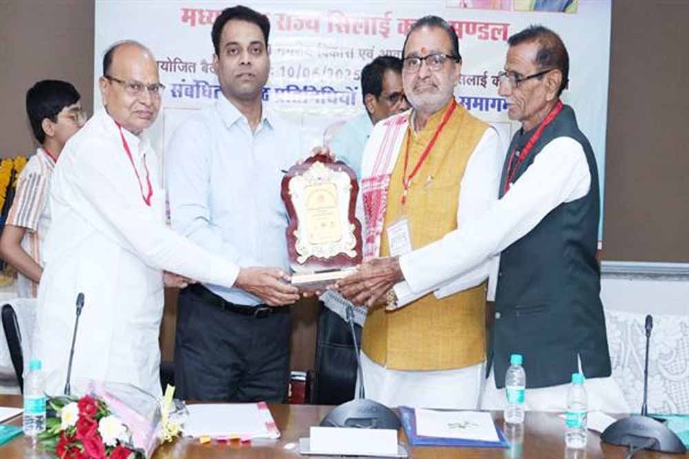 मध्यप्रदेश राज्य सिलाई कला मंडल के संचालक मंडल की बैठक मंगलवार को भोपाल के शिवाजी नगर स्थित पालिका भवन में आयुक्त नगरीय प्रशासन एवं विकास श्री संकेत भोंडवे की अध्यक्षता में हुई। बैठक में सिलाई कला मंडल के अध्यक्ष श्री मनोहर लाल महेश्वरी, सदस्य श्री सुरेश माहेश्वरी, श्री मांगीलाल सोलंकी सहित नगरीय निकायों से आए हुए सिलाई व्यवसाय से जुड़े हितग्राही मौजूद थे।