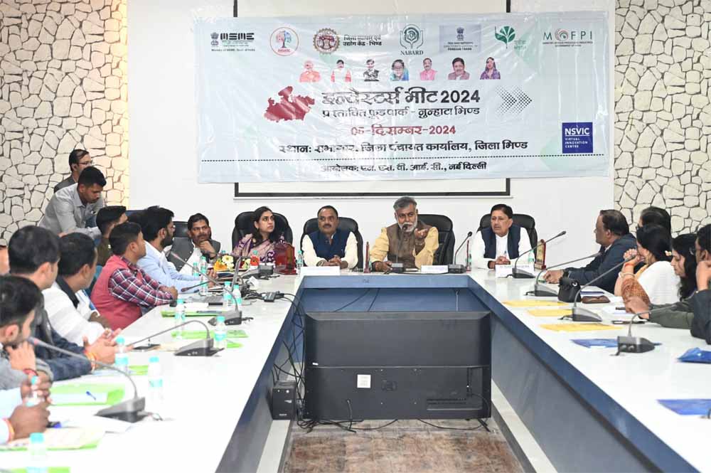 नवीन एवं नवकरणीय ऊर्जा मंत्री श्री राकेश शुक्ला ने कहा कि आज भिण्ड के ब्रांड को दुनिया में पहुंचाने की जरूरत है। जनप्रतिनिधियों और जिला प्रशासन के लगातार प्रयासों से एमएसएमई विभाग के अंतर्गत ग्राम नुन्हाटा में लगभग 300 हैक्टेयर भूमि पर फूड पार्क प्रस्तावित है। इन्वेस्टर्स मीट कार्यक्रम में बताया गया कि जिले के औद्योगिक विकास एवं रोजगार को सृजित करने के उद्देश्य से यह फूड पार्क विकसित किया जा रहा है, जिसका लाभ जिले के किसानों को मिलेगा एवं उन्हें प्रशिक्षण के माध्यम से प्राकृतिक खेती, सब्जियों की इंटरक्रापिंग, फलोद्यान विकास के लिये प्रोत्साहित किया जाएगा। कृषि उत्पाद आदि की बिक्री एवं अच्छे दाम दिलवाने की व्यवस्था फ़ूड पार्क में उद्योग स्थापित करने वाले उद्यमियों के साथ लिंक कर की जाएगी, जिससे कृषक क्राप डायवर्सिफिकेशन, वेजीटेबल इंटरक्रापिंग के प्रति भी आकर्षित होकर अपनी आमदनी को बढ़ा सकें।