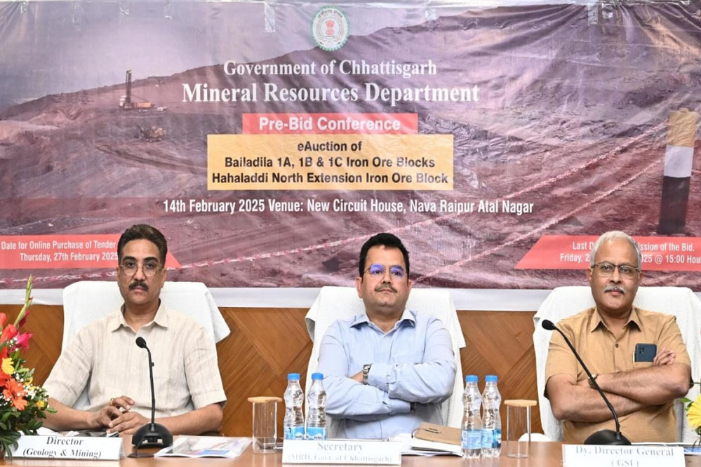 संचालनालय भौमिकी एवं खनिकर्म, छत्तीसगढ़ द्वारा बस्तर के बैलाडीला क्षेत्र के लौह अयस्क ब्लॉकों की नीलामी को लेकर आज नवा रायपुर के न्यू सर्किट हाउस स्थित कन्वेंशन हॉल में ‘प्री-बिड कॉन्फ्रेंस’ का आयोजन किया गया। इस बैठक में देशभर से आए खनन निवेशकों और बोलीदाताओं ने भाग लिया, जहां नीलामी प्रक्रिया, निवेश अवसरों, और खनिज संसाधनों पर विस्तृत चर्चा हुई।