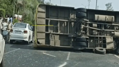 आज दोपहर में नर्मदापुरम रोड पर तेज रफ्तार बस पलटी , जाम लगा