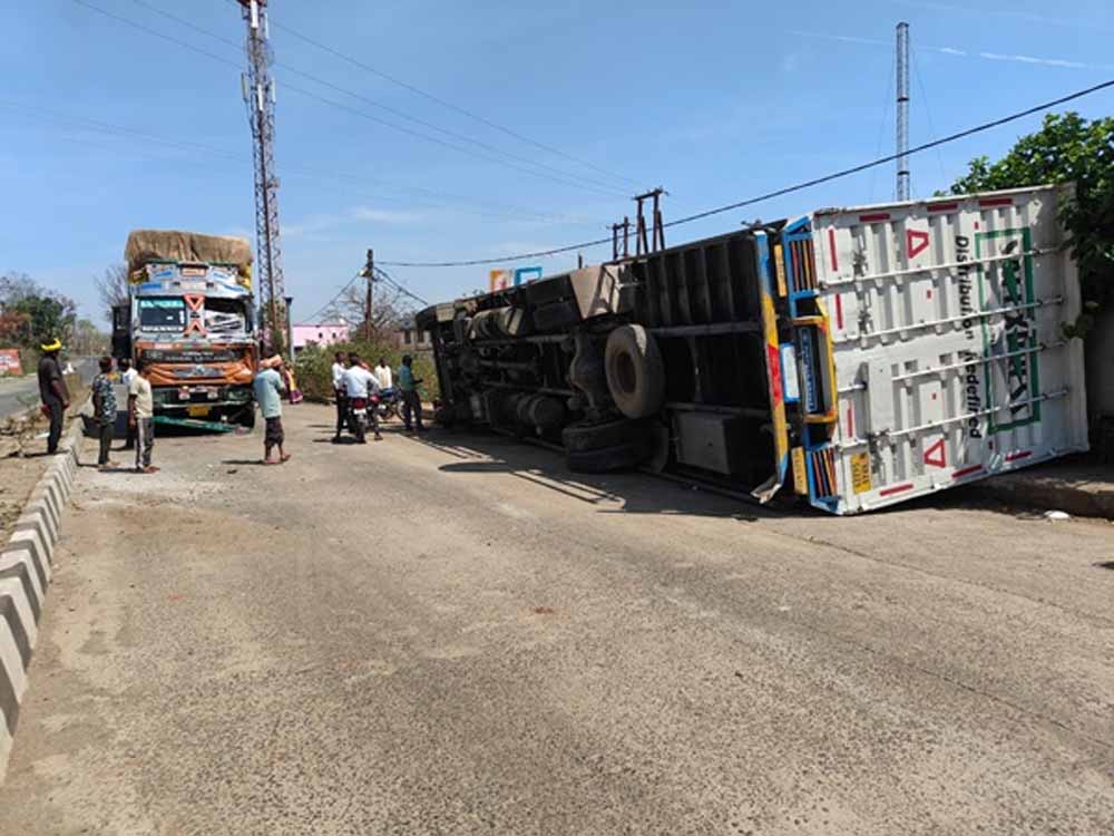 इधर… एनएच 30 पर कंटेनर पलटा, पीछे से आ रहा ट्रक भी टकराया