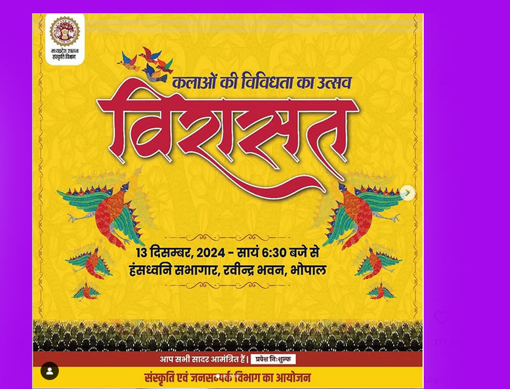 कलाओं की विविधता का उत्सव विरासत आज मध्यप्रदेश के वैभव को दिखाती नृत्यनाटिका, स्वस्ति मेहुल का गायन, रणदीप हुड्डा के अनुभव एवं प्रदर्शनियां होंगी आकर्षण
