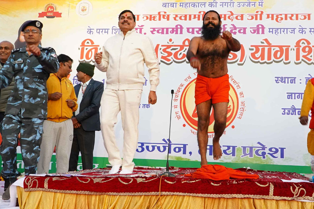 मुख्यमंत्री डॉ. मोहन यादव ने गुरूवार को प्रात: उज्जैन में योग ऋषि स्वामी रामदेव बाबा के शिष्य डॉ. स्वामी परमार्थ देव महाराज के सानिध्य में होमगार्ड मैदान में निशुल्क (इंटीग्रेटेड) योग शिविर में शामिल होकर योग किया। इस अवसर पर मुख्यमंत्री डॉ. यादव ने कहा कि योग मनोयोग से होता है, सहयोग से नहीं। योग मार्ग पर सब चले। योग हमारे जीवन की दिशा बदलता है। मुख्यमंत्री डॉ. यादव ने कहा कि फ्रीगंज का नवीन ब्रिज 21 मी. चौड़ा बनाया जायेगा। मुख्यमंत्री डॉ. यादव ने योग करने के बाद संबोधित करते हुए यह बात कही।